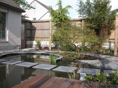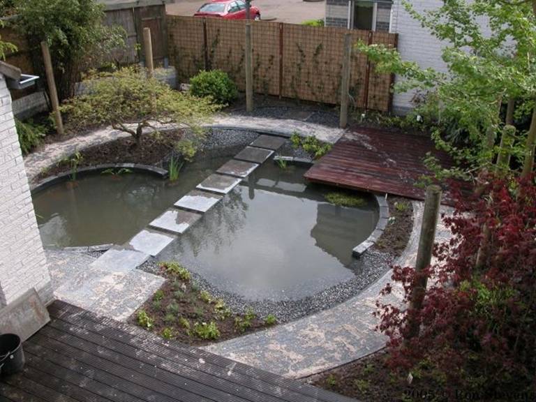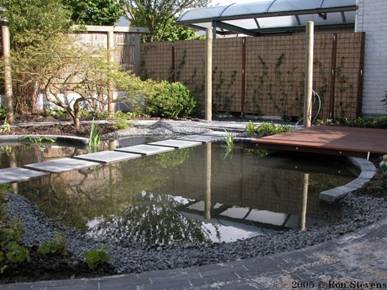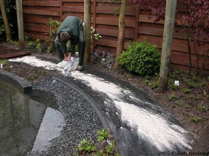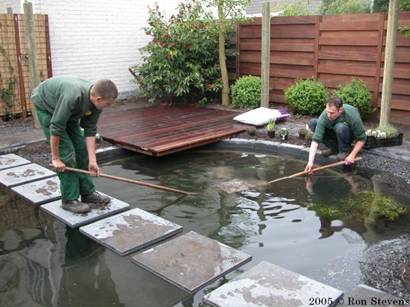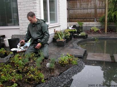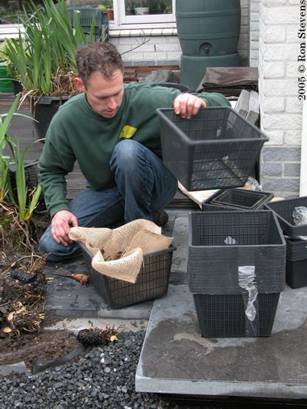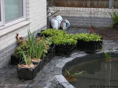 Vijverplanten worden in manden gedaan en in de vijver geplaatst |